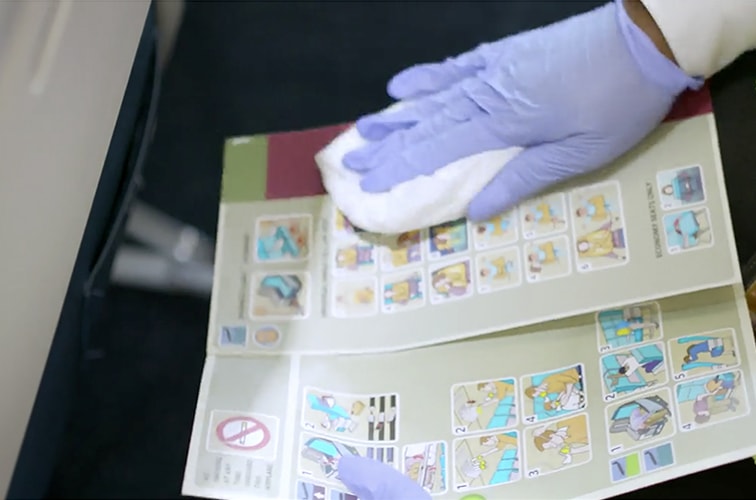 トレーテーブル、個人モニター、ひじ掛け、シートポケットなどお客様がよく触れる場所を殺菌シートで念入りに拭きます。
