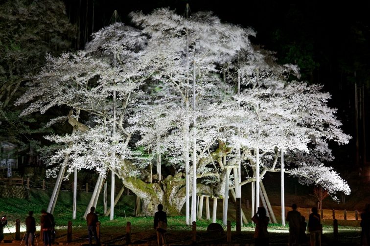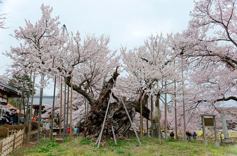 その姿をみて誰もが思うのは枝を支える無数の柱。これは花を咲かせる寿命をとうに超えながらも、けなげに花を咲かせ続ける老木を、人々が守っている証。まるで杖を突きながら今年も守ってくれる人々を喜ばせようとする健気さを感じずにはいられません。日本人なら一生に一度は見ておきたい桜です。
