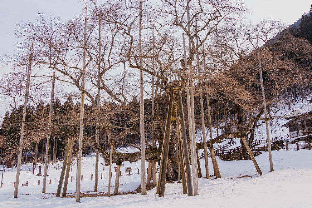 高さ16.3m、幹囲9,9m、枝張りは東西26.9m、南北20.2mの古木は、大正初期に大雪のために幹に亀裂ができ、一時は枯れてしまうのではないかという瀕死の状態に陥りました。昭和24年に再生プロジェクトが始まり、最近では幹にできた空洞が広がりつつも、必死で花を咲かせる姿が人々の心を打ちます。 また、常に地元の人たちの力で守られている、岐阜県が誇る名桜でもあるのです。