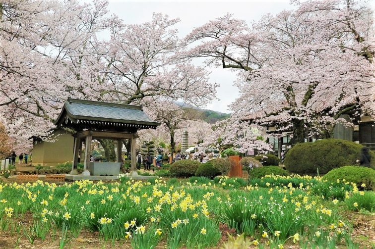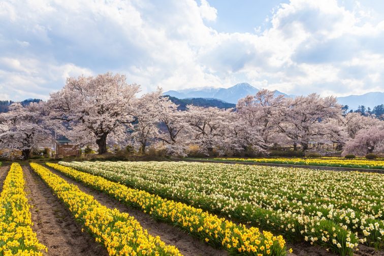 桜の開花と同時期に、実相寺周辺には約8万本のラッパ水仙が咲き乱れます。黄色の水仙、桜のピンク、そして背後に聳える南アルプスの姿は、絶好の映えスポット!