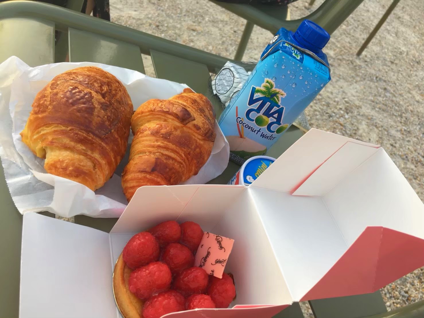 このホテルは3つ星ホテルながら、朝食がとても豪華です。飲み物は紅茶、コーヒー、ココアの中から選択し、スタッフの方に伝えます。飲み物とともに運ばれてくるのは、バゲット、クロワッサン、オレンジジュース、ヨーグルト、バターが乗ったトレー。その他の果物やパン、シリアルは自由に取りに行けるようになっています。