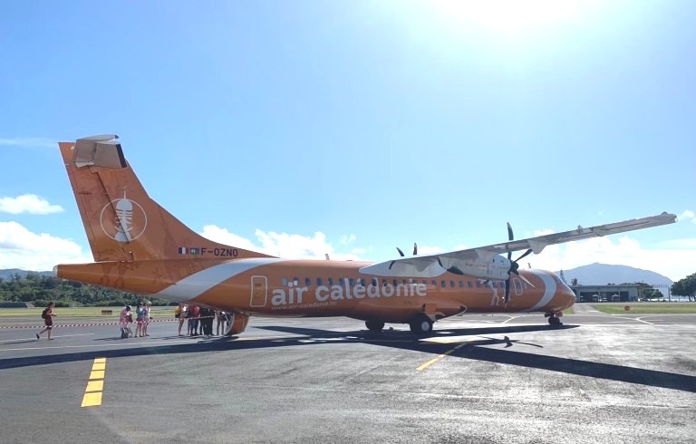 イルデパン島へは、エアカレドニアというニューカレドニア国内線で行くのが一般的です。小さな機内は狭く、左右2列ずつ全4列です。座席も指定されていないので奥から順に詰めて座ります。離陸と着陸時に見る空からの海も絶景なので、ぜひ写真に収めてほしいポイントです。