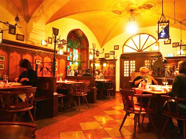 1階がビアホール、2階がレストラン、3階はショーを見ながらビールと食事が楽しめるフロア。3階はバイエルン地方の伝統の装束を身にまとった人々がバイエルン地方の民謡を奏でていて、思わず踊りだしてしまう陽気なゲストも多し。創業時からあるバイエルンの伝統の黒ビールが絶大な人気。