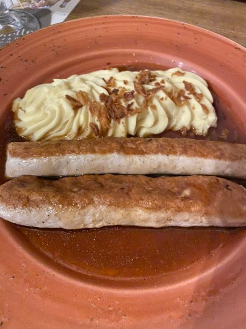 まず私たちはMÜNCHNER WOLLWÜRSTE (ソーセージとマッシュポテト)€14を注文。ドイツと言ったらソーセージとポテトですよね!日本の感覚ですとソーセージに「パリッ」とした皮の食感を求めがちですが、このプレートのソーセージは皮がなくソフトな口当たり。優しい味付けで飽きずに食べられます。1本1本が長く、2人で充分な量。しかも自家製のマッシュポテトの美味しいこと・・・。