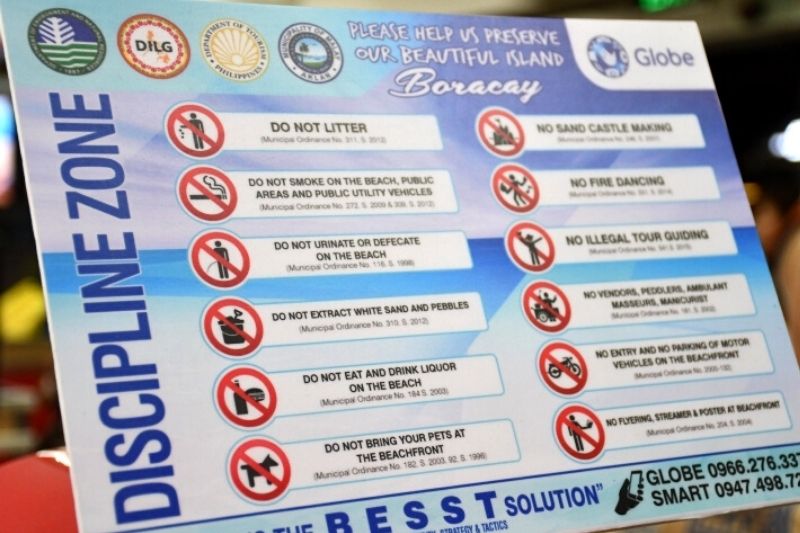 ボラカイ島では2018年のクローズ以来、徹底した環境保護活動を行っています。その一環として島のホテルやレストラン、公共のビーチエリアなど、いたるところで上記の写真のような12項目のルールが記載されたボードを見かけます。