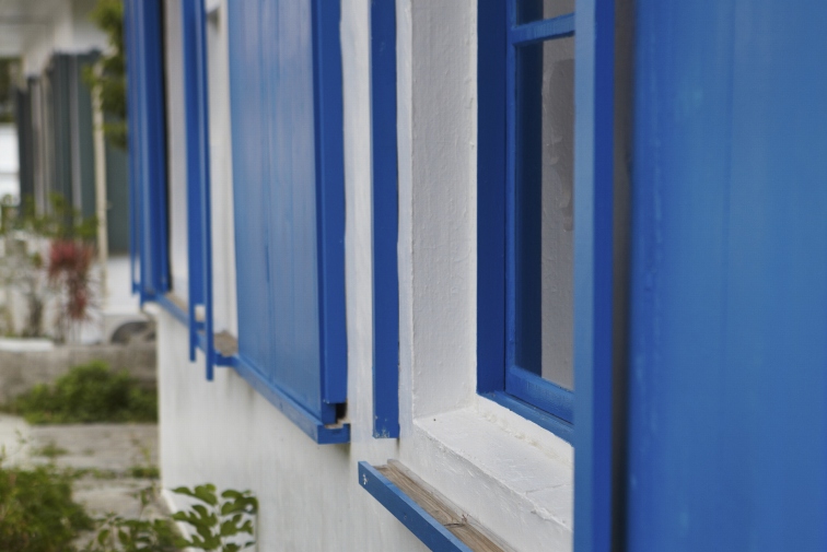 ウミカジテラスは小高い丘の上に約50軒のお店が並んでいます。お店はすべて壁一面真っ白。沖縄の海と空の青さに白の建物が映えて、まるでヨーロッパのような美しい光景です。
