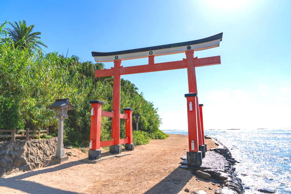 鮮やかな朱塗りの社殿が青空に映え、また島の周囲を囲む波状岩「鬼の洗濯板」など見所も豊富です。
