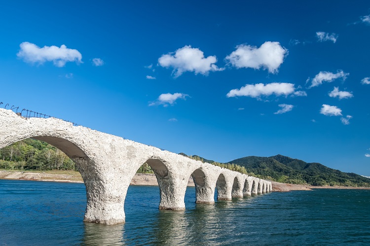 1955年に完成した糠平(ぬかびら)ダムとともに姿を表した「糠平湖」は、北海道で2番目に面積が大きい湖です。季節ごとに魅力的な姿を見せてくれる糠平湖ですが、最大の魅力は冬季にあります。真冬になると糠平湖の湖面は凍結して水位が下がります。そこで、姿を現すのが旧士幌線で使われていたタウシュベツ川橋梁です。ダム建設によって湖底に沈んだコンクリートアーチ型の美しい橋梁で、湖面の凍結期にしか姿を現さないことから「幻の橋梁」と呼ばれています。また、真冬の糠平湖ではワカサギ釣りを楽しむこともできます。