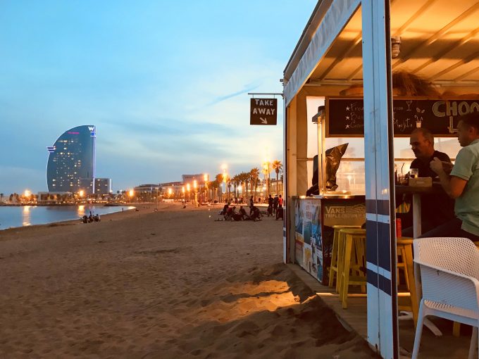 モンセラットから戻るとスペイン広場につきました。150番のバスに乗ってオリンピック公園を見ながらモンジュイック城でバスを降り、モンジュイックの丘から港の景色を観賞。それから下りはロープウェイにのりました。窓からは、サグラダ・ファミリアや巨大なクルーザーの並ぶヨットハーバーが見えて美しい景色が楽しめます。私達は先にバスでモンジュイック城まで行って、下りにロープウェイを使ったのでスムーズでしたが、上がり方面のロープウェイはとても混雑していました。ぜひ皆さんも先にバスでお城まで行って、ロープウェイは下りに乗車することをお勧めします。海岸まで降りて 海の家で波を見ながらワインを楽しみました。こちらも夜21時ころまで開いているのでお勧めですよ。その後にゴシック街を通って行ったサンタ・エウラリア大聖堂のあるカテドラル広場では、夜に大道芸を行っていて賑やかでした。是非そちらも楽しんでくださいね。