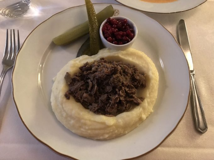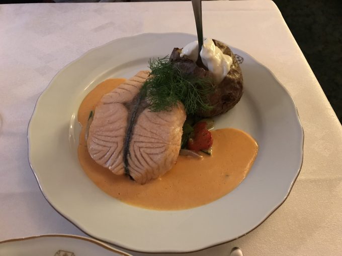 夜は「Ravintola Kosmos(ラヴィントラ コスモス)」でサーモンステーキとトナカイ肉を。有名店に予約なしで向かったので断られるかなと思いましたが、平日だったので入れました。ほぼ満席だったので予約した方が確実かもしれませんね。トナカイのお肉は、ステーキを想像していたらフィレ肉のようなものが出てきました。味は少し癖がありますが美味しいです。そして食べきれないくらい量が多いです。ポテトにフォークが刺さっているのも斬新で面白かったです(笑)。
