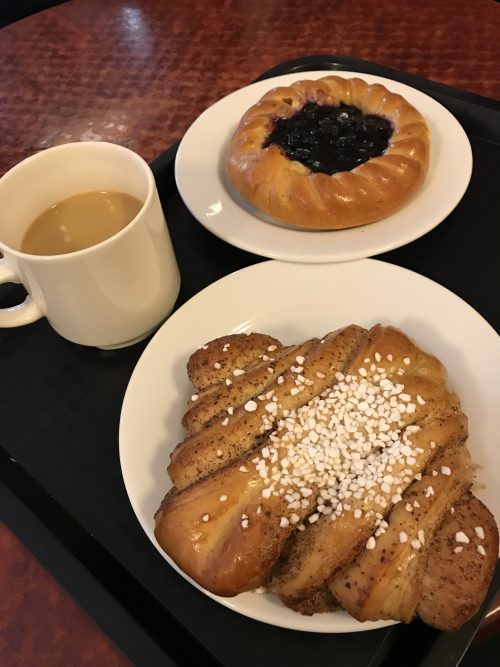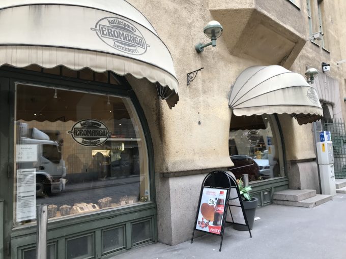そのあと「EROMANGA(エロマンガ)」というヘルシンキの老舗ベーカリーで朝ごはんを食べました。シナモンロールとブルーベリーパンをチョイス。ピロシキが美味しいとのことですが食べられなくて残念。温かいカフェオレはガラスコップでサーブされました。