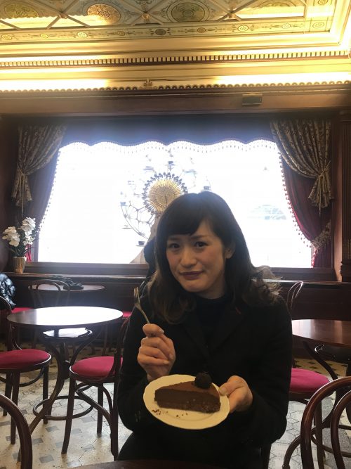 それから聖オラフ教会の展望台に登って、タリンの町を一望。私は高所恐怖症で早く降りたかったんですけどね(笑)。夜は予約必須の人気店でディナー。日本から自分達で予約を取りました。サーモンステーキとサラダ、お酒を1杯ずつ飲んで合計4,500円。1日目のヘルシンキのディナーが6,000円だったので、タリンはやっぱり物価が安いですね!翌日は朝一でタリン最古の老舗カフェ「Maiasmokk(マイアスモック)」でチョコレートケーキを。ケーキの中にラム酒が入っていて、噂どおり美味しかったです。固めのチョコレートケーキで、口に入れると「ミシミシ」と音がしてびっくりしました。