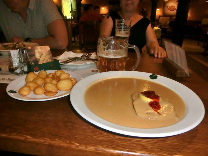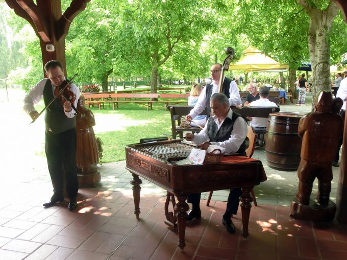 この後は、お楽しみのハンガリー名物料理。最初はハンガリーのスープ(グヤーシュ)。具材たっぷりでパプリカで風味が付けられ、これだけでも十分満腹です。食事中にはハンガリー音楽で華をそえてくれました。ハンガリー舞曲第5番をリクエストし、演奏してもらって大感動です。もちろん、美味しい地ビール・ドレーヘルも味わい、至福のときでしたね。