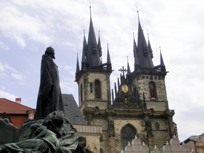 プラハ最終日は、空港から17:10のフライトで帰国の途につかねばなりません。プラハ城から歩き始め、マラー・ストラナ広場、聖ミクラーシュ教会を眺め、大勢の観光客をかき分けながらカレル橋、そして旧市街広場でちょうど11:00となり、旧市庁舎のからくり時計の動きを眺めました。さらに宗教改革に身をささげたフスの銅像とティーン教会を見てから、旧市街をぬけてヴァーツラフ広場と、定番のコースを歩きました。