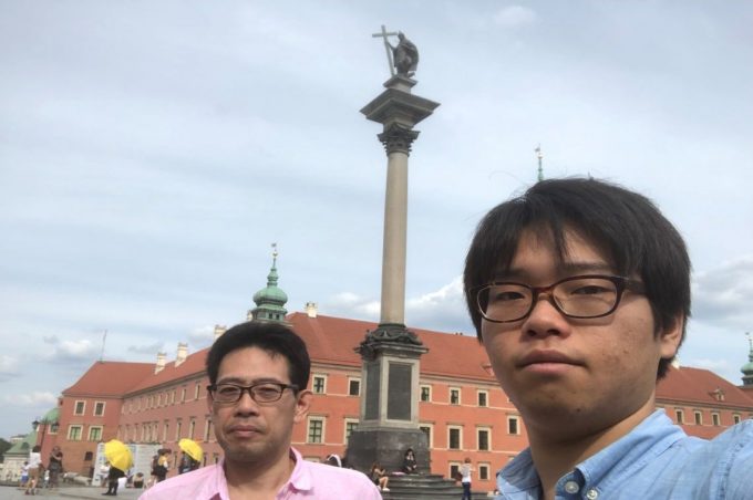 ポーランドのワルシャワの旧市街の王宮広場で長男と