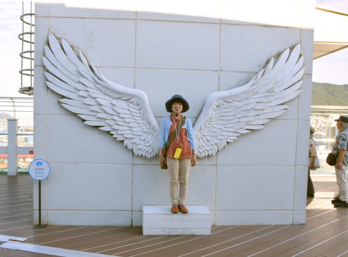9月18日は、釜山(韓国)へ寄港しました。もちろん現地ツアーに参加。数あるツアーから、私たちは「梵⿂寺観光&ショッピングツアー」を選びました。現地でポモサと呼ばれていた「梵魚寺」を観光し、「ロッテデパート」で噴水ショーを見ました。ロッテデパートの屋上では、天使になれるオブジェで記念撮影も!プチ韓国旅行を楽しみました。