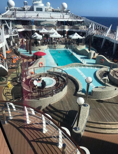 9月15日は、目的地までの航海日です。丸一日船上で過ごしましたが、設備が充実しているので船上でバカンスのようにのんびりと楽しめました。私たちはデッキにある屋外プール、屋根付きプール、ジャグジーへ。プールは少し冷たかったですが、ジャグジーはあたたかかったので気持ちよかったです。