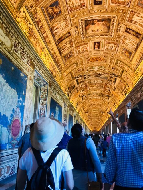 まずはヴァチカン美術館とシスティーナ礼拝堂へ。日本で事前に1番早い時間帯のチケットを購入していたので、スムーズに入れました。ダヴィンチの絵画や宗教画、ミケランジェロが描いた天井は本当に素敵で、雑誌やTVでみるそのままが目の前に広がり感動しました。