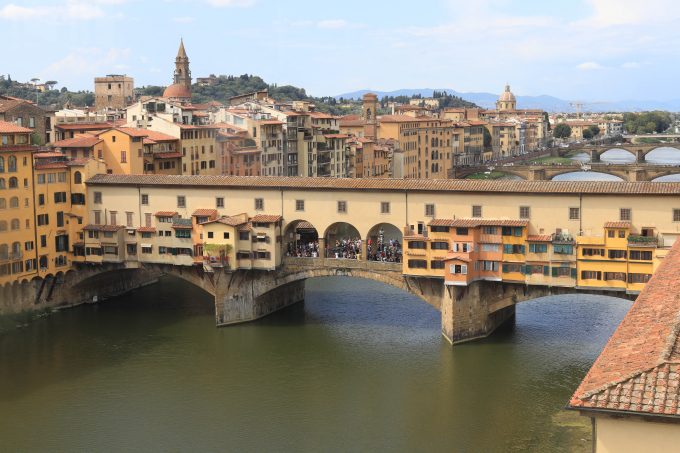 その後はウフィツィ美術館へ。ボッティチェリやラファエロなど、名作の宝庫で、天井画なども素晴らしく、ため息の連続。窓からヴェッキオ橋が見えるスポットもあり、3時間ほどかけて見ましたが、本当は1日かけて見ても時間が足りないくらいです。ヴェッキオ橋の通路の両側は、ほとんどが宝飾品の店!渡りきった向こう側のワインのお店「Fuego Srl」で昼食をいただきました。テラス席が空いていれば、そこからヴェッキオ橋を眺めながら食事ができそうです。