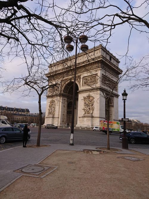 夕食は、Google Mapで検索してホテルから歩いて10分ほどのシャンゼリゼ通りにあるレストランにて。食事、飲み代入れて8,500円ほどでした。夕方のライトアップされた凱旋門で記念撮影。ホテルから凱旋門までは歩いて1、2分くらいでした。