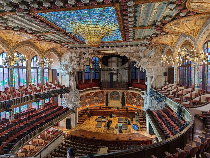 3月9日の夜に成田を発ち、ドーハを経由して、翌日の3月10日の13時頃にバルセロナに到着しました。まずは宿泊ホテル「ホテル アトランティス」に向かいチェックイン。駅から近く便利なホテルでした。荷物だけおいてすぐに観光に出かけました。はじめに見に行ったのは「カタルーニャ音楽堂」。内部を見学しましたが、ものすごく美しい! 内装やステンドグラスが素晴らしかったです。他の観光客の方が写真を撮ってくれたりと、はじめから楽しい観光となりました!