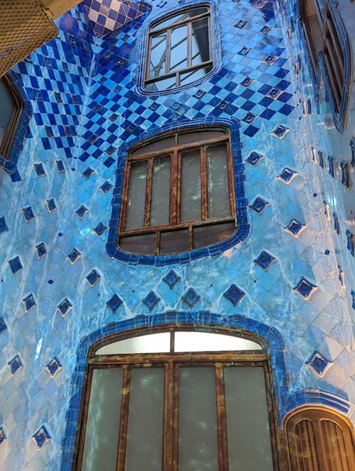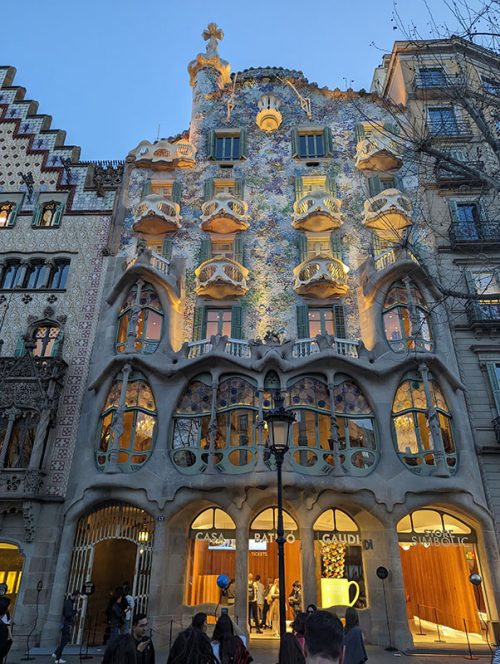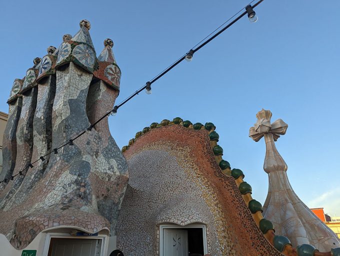 可愛らしい建造物「カサ・アマトリェール」に向かいます、1階のカフェで軽食をいただきました。バルセロナ名物のホットサンド“BIKINI(ビキニ)”が美味しかったです。次に予約をしておいた「カサ・バトリョ」へ。ここが想像以上によかったです。外観はもちろんのこと内装も素晴らしく、夕方頃で中でプロジェクションマッピングも映し出されたのですが、とにかくきれいで感激しました。