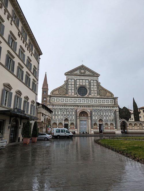 3月14日、朝9時半頃に高速列車に乗り、ベネチアからフィレンチェに移動しました。お昼頃に到着し、宿泊する「ホテル アルバーニ フィレンツェ」に移動してチェックイン。まずは「サンタ・マリア・ノヴェッラ教会」を見に行きました。外観だけ見学して、近くにある世界最古の薬局「サンタ・マリア・ノヴェッラ薬局」へ。お買い物はとくにしませんでしたが、雰囲気を楽しみました。