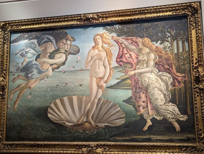 昼食に「Trattoria I Fratellini」でパニーニをいただきました。美味しいのですがボリュームがすごい!2人で1つで十分なほどのサイズで驚きました。ジョットの鐘楼に登りたかったのですがこの日は残念ながら雨でしたので、「ウフィツィ美術館」に行くことに。有名な絵画『ヴィーナスの誕生』くらいは楽しめましたが、美術にうといので絵画鑑賞はちょっと疲れました(笑)。