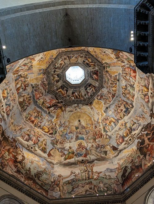 3月15日、晴れたので朝から「ドゥオーモ(サンタ・マリア・デル・フィオーレ大聖堂)」へ! 無料なので予約はできないためかなり並んでいました。30分以上1時間以内くらいかな、並んでから中へ入りました。天井に描かれた絵画などがすごかったです。ドゥオーモは外観も内部もとても美しく歴史を感じました。上にも登れますが、ここでは登りませんでした。
