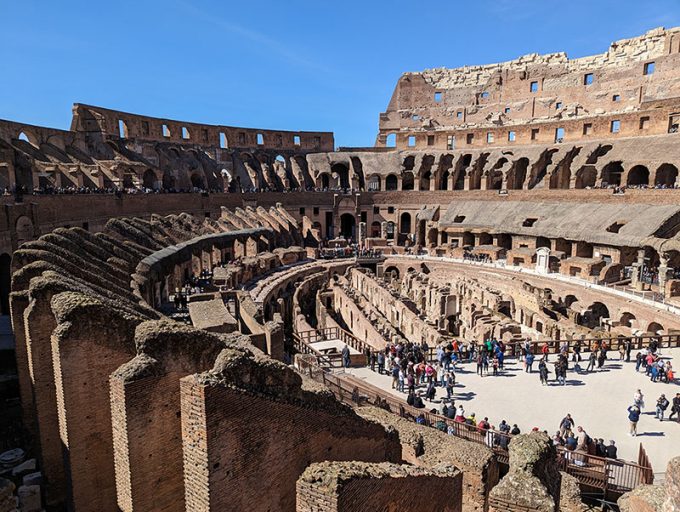 またバスに乗り「コロッセオ」へ移動しました。事前予約をしておいたので内部の見学へ。内部は確かにすごかったですが、想像どおりというかんじも(笑)。迫力のある外観のほうが感動しました。