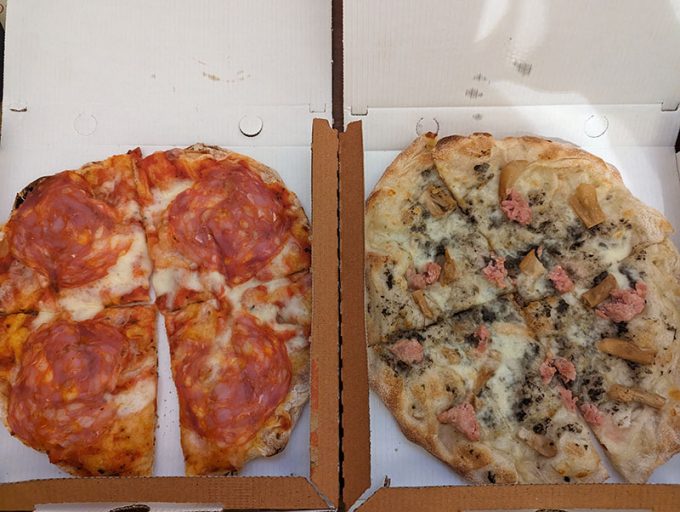 夕食は、ホテルの近くのピザ屋さん「PINSALLEGRA」で、ピザをテイクアウトしました。安くて美味しかったので、食事を簡単に済ませたい方には最適です!
