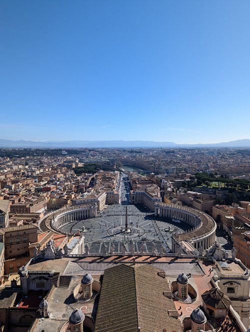 3月17日、朝イチで「バチカン市国」へ向かいました。まずは「サン・ピエトロ寺院」へ行きました。無料なので予約はできないのですが、結構すんなり入れたのでよかったです。出る頃にはすごい並んでいたので、朝行くのがおすすめです。サン・ピエトロ寺院の内部は、宗教的な歴史などを感じとれて圧倒されました。螺旋階段を登って(エレベーターは途中まで)上に行けるのですが、そこからの景色も圧巻! 広場を眼下に見下ろすことができ、迫力のある眺望を満喫しました。