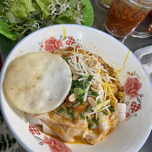 ハン市場でのお買い物の後は、昼食を食べに市場の近くの有名店「Mì Quang 1A(ミークアン1A)」へ。ミークアンはダナン名物の麺料理です。日本の“きしめん”にも似た麺に、たっぷりの野菜と砕いたピーナッツ、お肉やエビ、ゆで卵などが乗り、魚介からとった出汁をベースにした甘辛のタレで和えた“汁なし混ぜそば”といったかんじでした。これもとっても美味しかったです! 食べ終わった後はタクシーでいったんホテルに戻りました。