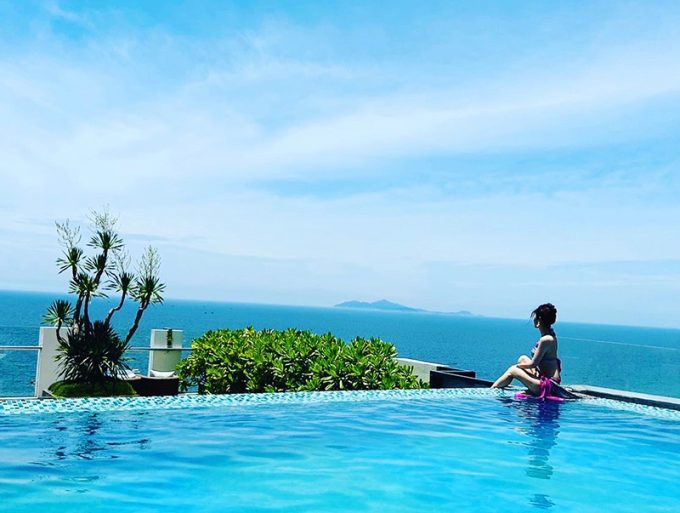 朝食後はホテルのルーフトップ・プールへ。目の前の海を見下ろす絶景プールでした。お昼まで2時間くらいプールで遊んだり、飲み物を飲んだりして過ごしました。お昼にはプールから出て、部屋で着替えてからランタンで有名な観光地「ホイアン」へ行くことに。