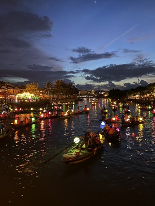 日が暮れてからは、夜のホイアンを散策。ちょうどフェスティバルが行われていたので、川に小さい灯籠を灯した船がたくさん浮いていて、幻想的で素敵でした。何百というくらい船が出ていて、カラフルな光であふれてすごくキレイな光景でした。ホイアンは昼の街並みとランタンが灯る夜の街並み両方を見るのがおすすめです。 お土産なども購入して、3時間はもう過ぎていたのでタクシーの待ち合わせ場所へ。運転手さんがちゃんと待っていてくれてよかったです。ホテルに戻り、また行きと同様チップを含め50万ドンを渡しました。