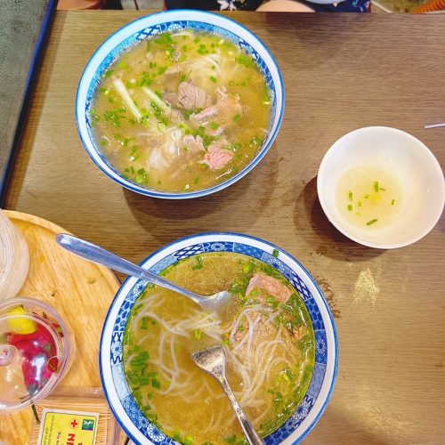 途中でお腹が空き、バーにも食事はあるのですが観光客向けのフードなので、ベトナム料理が食べたくてお店を探すことに。宿泊しているホテルの裏側は繁華街になっていて、いろいろとお店がありました。24時くらいでしたが営業しているお店はいっぱい、にぎやかで明るいしダナンで夜でも歩けます。歩いて見つけたフォーのお店に入店。 “フォーボー”と“ブンボー”を注文。違いは麺。ブンボーのほうが好みでした!