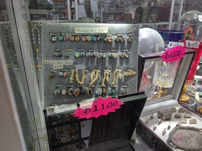7月13日、この日は最終日で深夜の飛行機なので、それまではメキシコシティでお土産屋さん巡りをして過ごしました。午前中はガイドブックに載っていた、“カテドラル・メトロポリターナの御守り”が欲しかったので探しに行きました。売店に売っているらしいけど、日本人が思う神社の売店っぽい売店なんて見あたりませんでした。観光案内してくれそうな人に聞き、お土産屋さんの建物を案内してもらいましたが見つからず。時間切れで一度ホテルに戻り、チェックアウトの手続きを済ませました。荷物をホテルに預け、空港へのタクシーの予約を18時にお願いして、御守り探しに再挑戦です。結局案内してもらった建物の2階のキリスト教グッズを売っているお店で見つけて買うことができました!