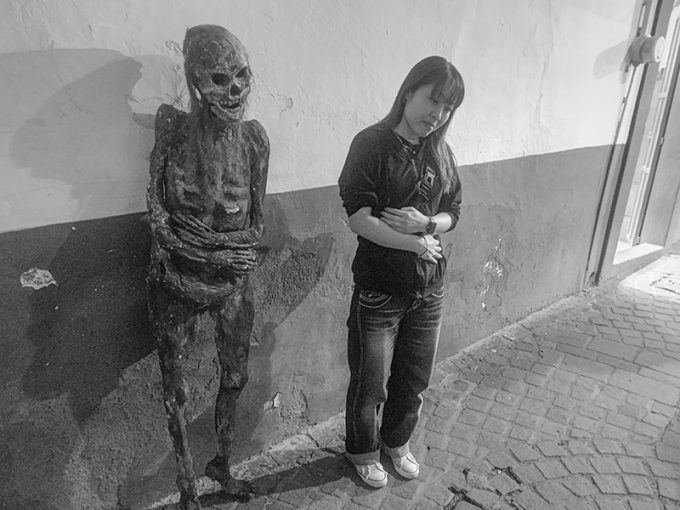 街中のガイコツと