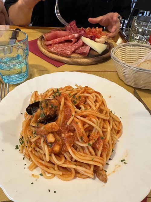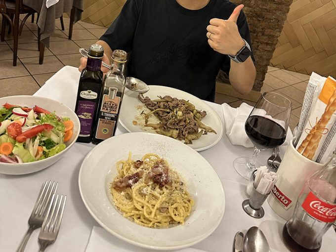 ホテルに荷物を置いて、夕食に出かけました。「Antica Boheme」というお店で、カルボナーラやサラダなどをいただきました、とても美味しかったです。ワインも飲んで移動の疲れを癒やしました!
