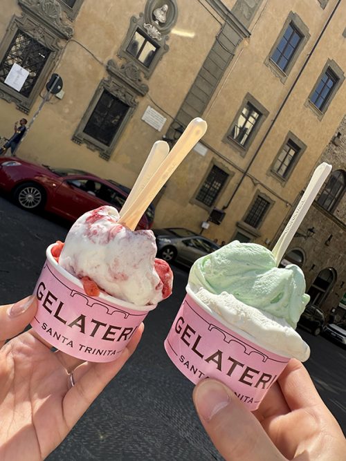 昼食を食べに前日と同じ中央市場に向かいました。その日はパニーニをいただきました、大きくて美味しかったです。その後、お茶をして涼んだり、「Gelateria Santa Trinita」でジェラートを食べたりと、フィレンツェのグルメや散策を満喫しました。
