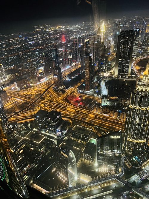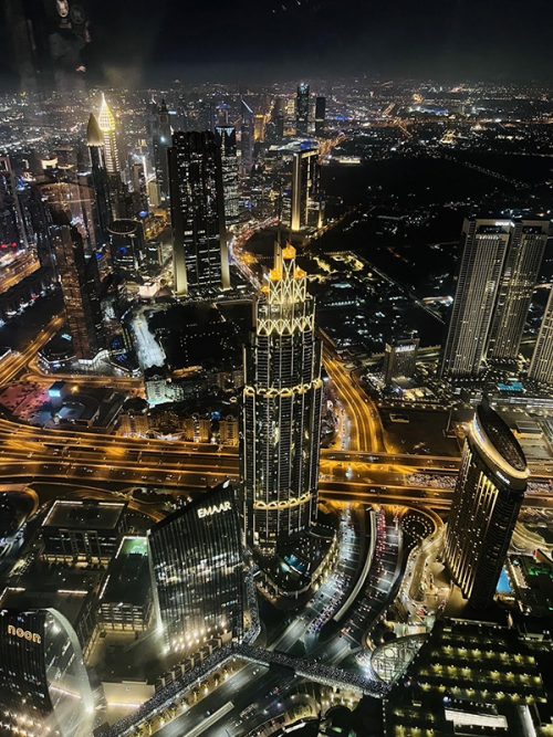 夜は、20時に予約してあった「ブルジュ・ハリファ」に入場。しかし何らかのトラブルで1時間も待たされました。ようやく入場して登ったブルジュ・ハリファの展望台「アット・ザ・トップ」から見たドバイの街並みはとてもきれい! その感動は言葉にできないほど素晴らしかったです。世界一高いビルからの夜景を存分に堪能し、22時過ぎにはブルジュ・ハリファを出てホテルに戻りました。