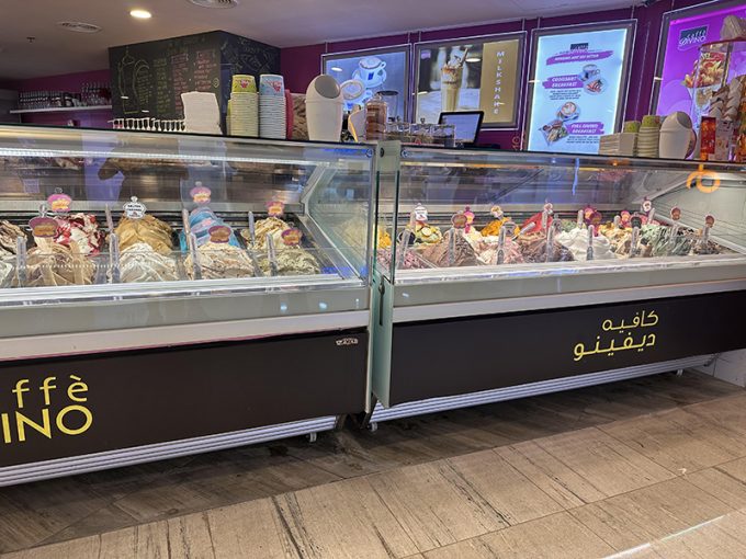 昼食は、ドバイ・モール内にあるファーストフード店にて。夕方にはもモールからも見える、屋外で行われている世界最大の噴水ショー「ドバイ・ファウンテン」を鑑賞しました。その他、モール内を散策したり、アイスを食べたりして楽しみました。とてもカラフルなアイスがたくさんありましたよ。夕食は︎、スーパーでおつまみなどを買って帰りました。