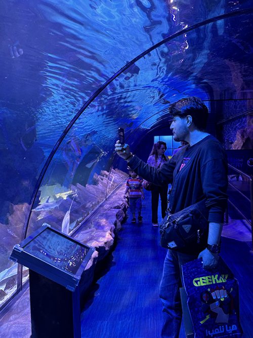空港からはホテルに移動してチェックイン。ホテルで休んでから「ドバイ・モール」へ出かけました。巨大なショッピングモール内には、ショップだけでなく様々なエンターテインメント施設が入っています。私たちは「ドバイ水族館 & 水生生物園」へ。VIPチケットと通常チケットの2種類があり、VIPチケットを購入して水族館の全体を楽しみました。