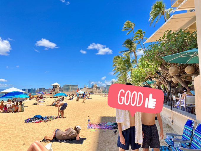 8月13日、朝からタクシーで海辺のレストランカフェ「ハウツリー」へ。ブランチにエッグベネディクトやロコモコをいただきました。レストランの目の前が「カイマナビーチ」なので、午前中いっぱいはビーチで遊んで過ごしました。建物で日陰もできていて快適なビーチでした。