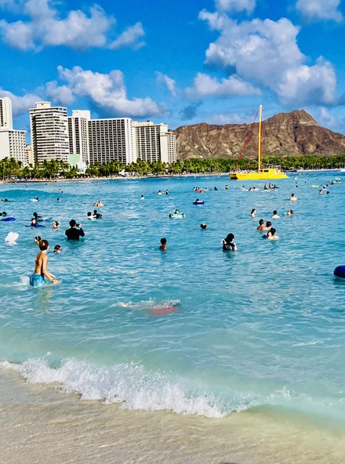 ビーチからホテルの帰り道は、「カピオラニ公園」をお散歩しながら。途中「テディーズ ビガー バーガー」でランチをとりました。ハワイで22年連続『ハワイBESTバーガー賞受賞』の記録を更新中だそうで、確かに今まで食べたハンバーガーの中で1番美味しかったです! たまたま入ったのですが、有名なところで美味しいランチになりよかったです。その後、またお店近くのビーチで海遊び。大学生と高校生の息子が楽しんで遊んでいました。ワイキキ周辺はどこにでもビーチがあり、気軽に海で遊べるのが魅力です。