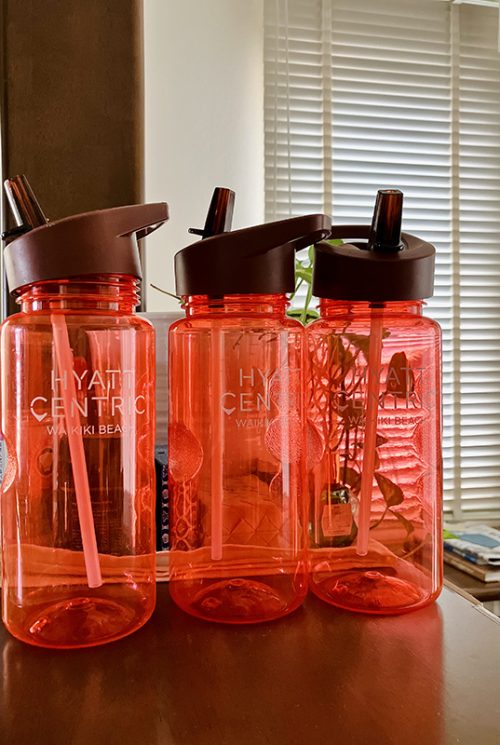 利用したホテル「ハイアット セントリック ワイキキビーチ」もすごくよかったです。オシャレなかんじのデザイナーズホテルで、施設はきれいでしたし、フロントのスタッフがとにかく親切でした。初日にタクシーに携帯を忘れたのですが、フロントの方が電話してくれてホテルに届けてもらいました。お礼にチップを渡そうとしても受け取らず、サービス精神に溢れていました。別の日には日本人スタッフも居て、込み入ったことも相談できたので安心でした。フロントで両替ができないのは残念でしたね、すぐ近くのインターナショナルマーケットプレイスで両替しました。あと、1人ひとつオシャレなウォーターボトルをいただけて、フロントのウォーターサーバーでお水を入れ放題でした。物価も上がっていたのでこれには大変助かりました。この思い出のウォーターボトルは、今でも家で使っています♪