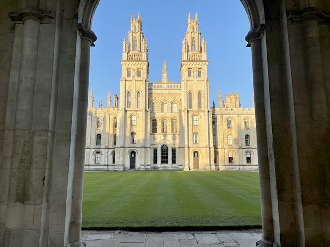 オックスフォード到着後、自身で駅前にホテルをとっていたので、荷物を置いて急いで観光へ。「オックスフォード大学」へ行き中庭を見学したり、その他、映画『ハリー・ポッター』のゆかりの地を見に行ったりしました。時間が遅くて閉まっていたので遠くからの見学になりましたが。オックスフォードは街全体に古い建物が多く雰囲気がありました。その後はお土産のお買い物。『ハリー・ポッター』のグッズやオックスフォード大学をブランド化したようなグッズを購入しました。