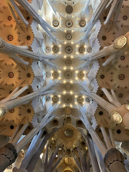 いったんホテルに戻って昼寝をしてから、17時に予約をした「サグラダ・ファミリア」へ歩いて向かいました。夕方の内部は赤のステンドグラスから日が差し込んでキレイだと聞いていたので、17時に予約。5分も並ばずに入場できました。実際に内部はとても素晴らしかったです、天井もすごくキレイでした。アプリをインストールして音声ガイドを聞きながら、1時間半ゆっくりと楽しみました。