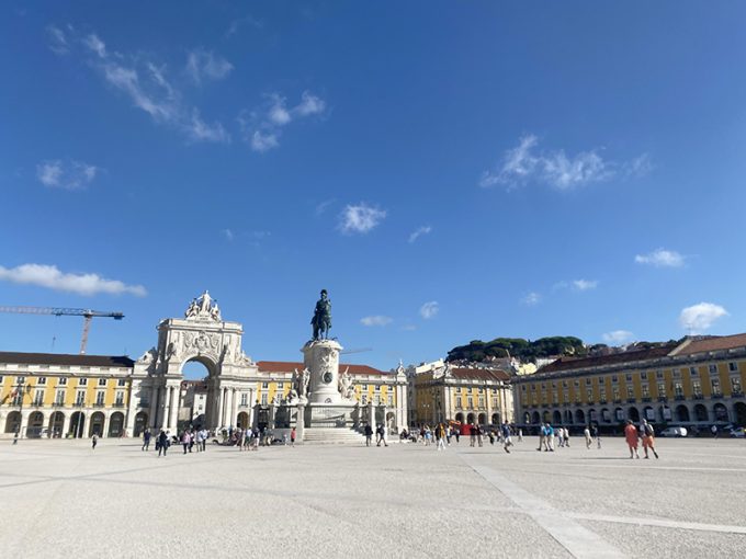 リスボンのホテルではじめての朝食。1階の朝食会場でいただいたのですが、エッグタルトが置いてあったりと種類が豊富で充実していました。夜はレストランバーになっていて一般客も利用できるようでした。朝食後は、ホテルから歩いて5分の「コルメシオ広場」へ。観光の拠点となるような場所です。