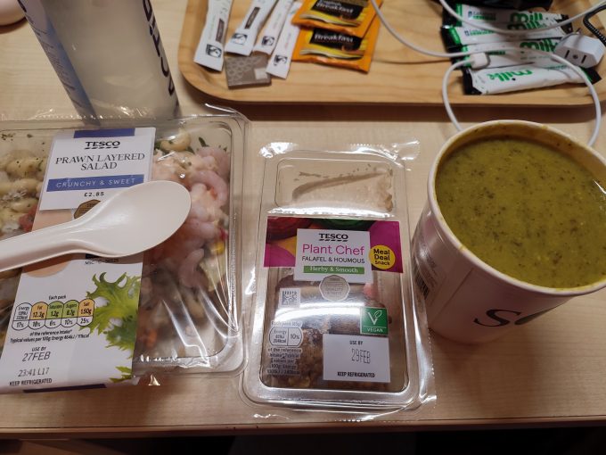 この日の夕食には、夜遅くまで営業しているスーパーTESCOのミールセットを購入しました。ホテル最寄りのラッセルスクエア駅の向かいにあります。メイン、スナック、ドリンクがセットで3.9ポンド(約800円)ととてもリーズナブル。メニューは豊富で、私は小エビのサラダ、大豆のミートボール、お水を選びました。ただ、注意したいのは、カトラリーはついていないこと。どこにも売っていなくて、カトラリーのために隣のカフェでスープを購入することになり、結局高くついてしまいました。プラスチックフリーが進んでいるので、日本から持参していった方がいいかもしれません。